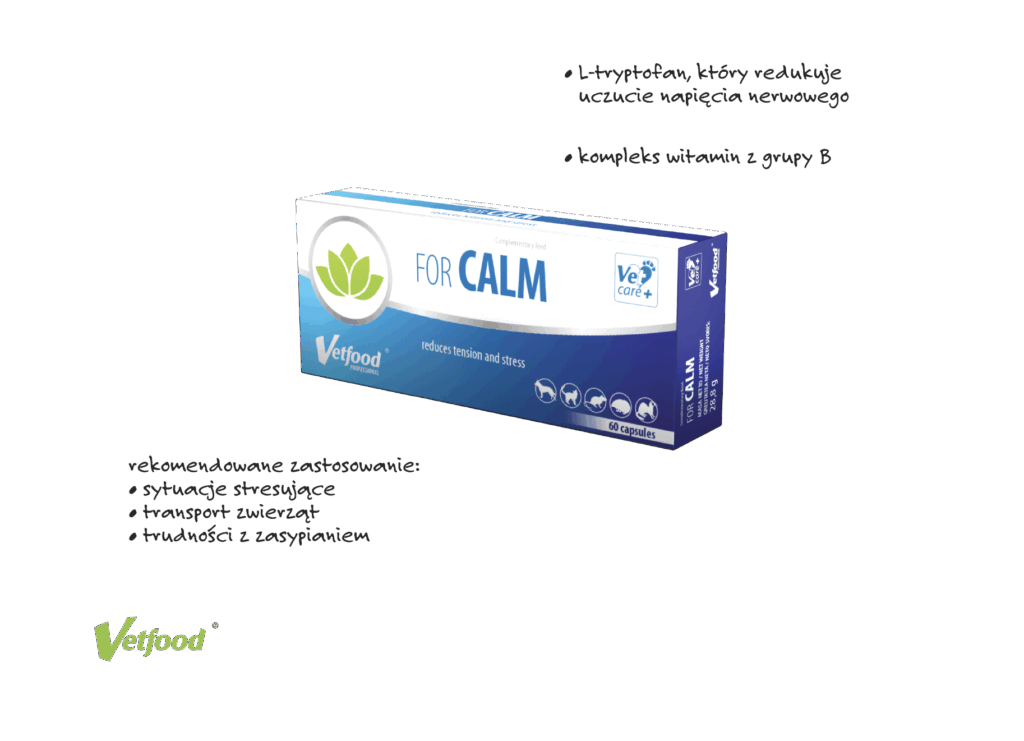 For Calm to karma uzupełniająca, która została opracowana, tak aby wspierać naturalne mechanizmy radzenia sobie ze stresem. Zawarte w niej składniki, m.in. tryptofan, witaminy z grupy B i ekstrakty roślinne, pomagają łagodzić napięcie nerwowe, wspierają dobre samopoczucie i poprawiają komfort psychiczny zwierzęcia.